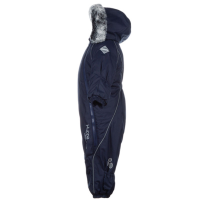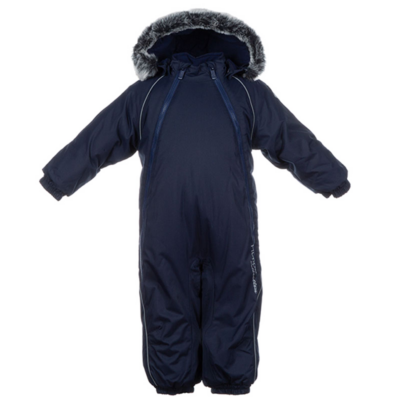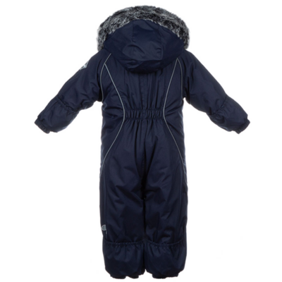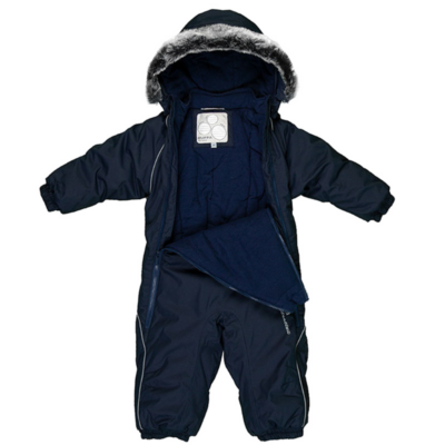 Babies’ modern waterproof and windproof winter overall Breathable fabric Flannel lining on the inside Integrated elastic band at sleeve and leg ends and at waist on the back The removable snap-on hood is safe for when the child gets stuck when playing outside Sleeve and leg ends can be conveniently rolled down in sizes 68–80 Waterproof taped seams The product comes with both silicone and rubber foot straps Faux fur trim on hood The high-performance top fabric is great to wear for children in any winter weather The insides of leg ends are also covered with the main fabric to keep the child dry Numerous reflective elements on the top fabric ensure visibility from all sides in the dark winter time