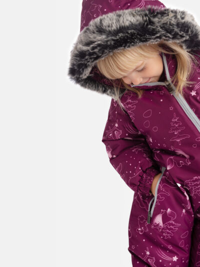 Babies´ waterproof and windproof winter overall with 300g insulation. The breathable fabric and soft flannel lining on the inside ensure all-day comfort. Designed with practicality in mind, it features elasticated sleeve and leg ends, as well as an elastic waistband at the back. The removable snap-on hood is safety-conscious. In sizes 68–80, the sleeve and leg ends can be rolled down for extended wear. Fully taped waterproof seams, a faux fur trim on the hood, and reflective details on the outer fabric complete the design for comfort, safety, and style.