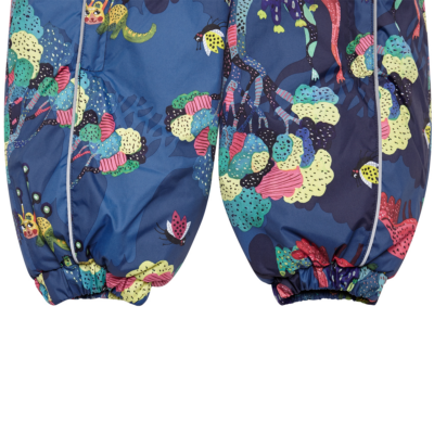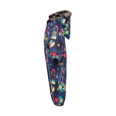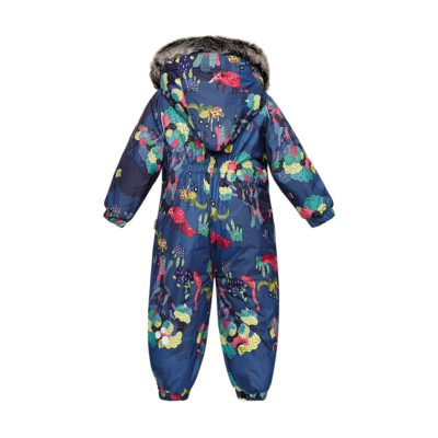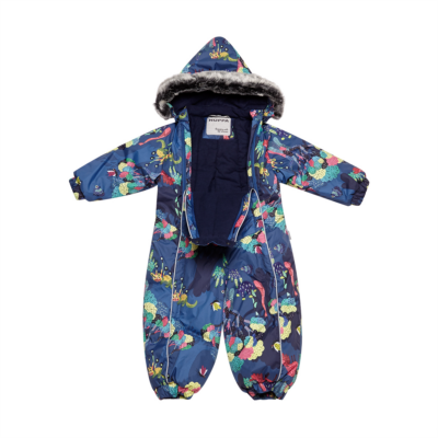 Babies’ waterproof and windproof winter overall. Breathable fabric. Flannel lining on the inside. Integrated elastic band at sleeve and leg ends and at waist on the back. Removable snap-on hood. Sleeve and leg ends can be conveniently rolled down in sizes 68–80. Waterproof taped seams. The overall has no inner leg seam. The product comes with both silicone and rubber foot straps. Faux fur trim on hood. Reflective elements on fabric.
