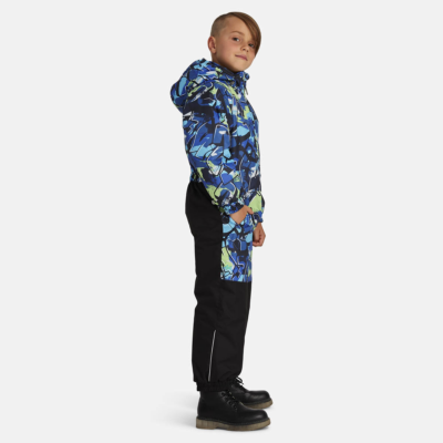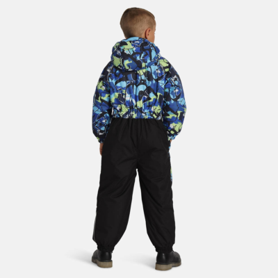 Children’s waterproof and windproof overall Breathable fabric Flannel lining on the inside Integrated elastic band at sleeve and leg ends and around hood Removable snap-on hood Integrated zipper pocket at front Waterproof taped seams Elastic foot straps Reflective elements on fabric