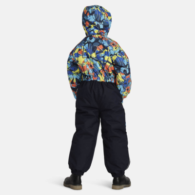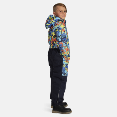 Children’s waterproof and windproof overall Breathable fabric Flannel lining on the inside Integrated elastic band at sleeve and leg ends and around hood Removable snap-on hood Integrated zipper pocket at front Waterproof taped seams Elastic foot straps Reflective elements on fabric