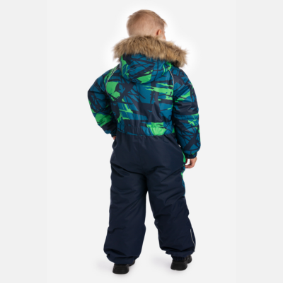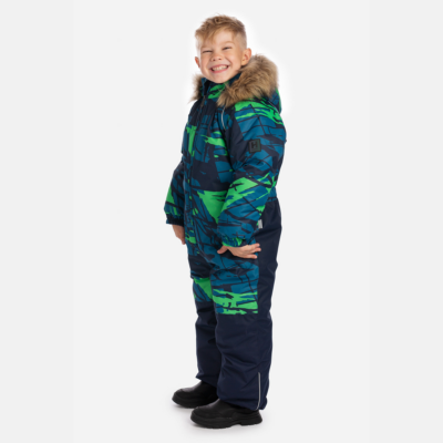 Children’s waterproof and windproof overall. Breathable fabric. Soft fabric on the inside. Integrated elastic band at sleeve and leg ends. Removable snap-on hood. Integrated zipper pocket at front. Waterproof taped seams. Elastic foot straps. Removable faux fur trim on hood. Reflective elements on fabric.