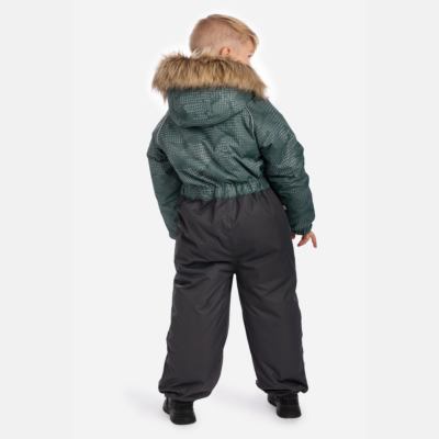 Children’s waterproof and windproof overall. Breathable fabric. Soft fabric on the inside. Integrated elastic band at sleeve and leg ends. Removable snap-on hood. Integrated zipper pocket at front. Waterproof taped seams. Elastic foot straps. Removable faux fur trim on hood. Reflective elements on fabric.