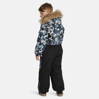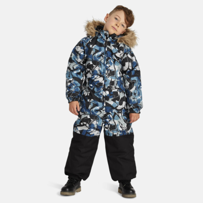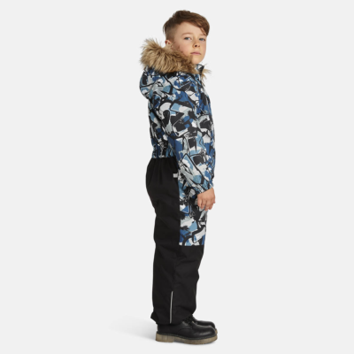 Children’s waterproof and windproof overall Breathable fabric Soft fabric on the inside Integrated elastic band at sleeve and leg ends Removable snap-on hood Integrated zipper pocket at front Waterproof taped seams Elastic foot straps Removable faux fur trim on hood Reflective elements on fabric