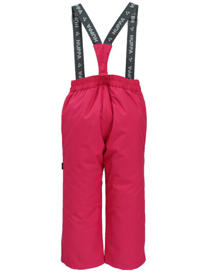 Children’s waterproof and windproof pants. Breathable fabric. Soft mesh lining on the inside of the pants. Adjustable removable braces. Integrated elastic band at waist. Drawstring tunnel and snow gaiters at leg ends. Waterproof taped seams. Reflective elements at the bottom.