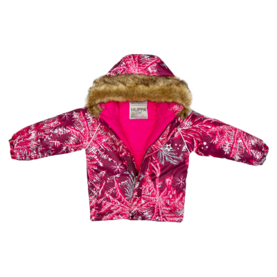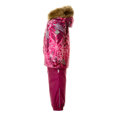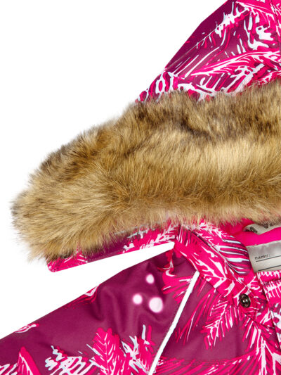 Children’s jacket and pants set. Waterproof and windproof, breathable top fabric. Soft mesh lining on the inside of the jacket and pants. Integrated elastic band at sleeve ends . Removable snap-on hood. Faux fur trim on hood. The bib pants have elastic adjustable braces. Integrated elastic band on waist. Waterproof taped seams. Reflective elements on both jacket and pants.