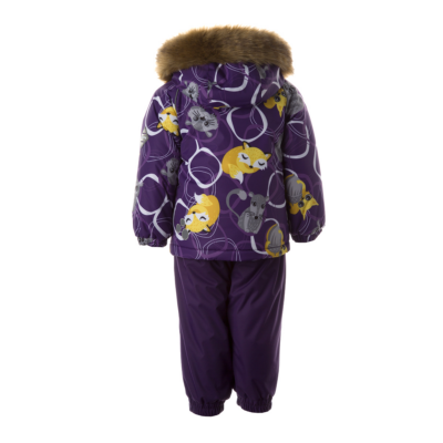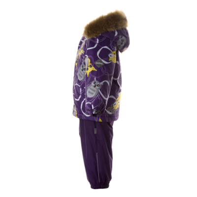 Children’s jacket and pants set. Waterproof and windproof, breathable top fabric. Soft mesh lining on the inside of the jacket and pants. Integrated elastic band at sleeve ends . Removable snap-on hood. Faux fur trim on hood. The bib pants have elastic adjustable braces. Integrated elastic band on waist. Waterproof taped seams. Reflective elements on both jacket and pants.