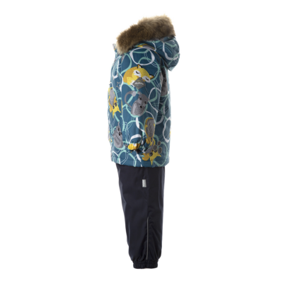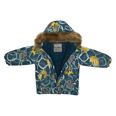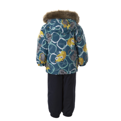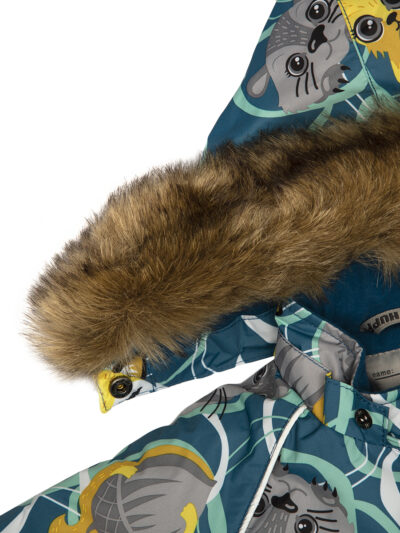 Children’s jacket and pants set. Waterproof and windproof, breathable top fabric. Soft mesh lining on the inside of the jacket and pants. Integrated elastic band at sleeve ends . Removable snap-on hood. Faux fur trim on hood. The bib pants have elastic adjustable braces. Integrated elastic band on waist. Waterproof taped seams. Reflective elements on both jacket and pants.