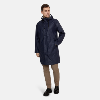 Men’s windproof raincoat. Drawstring on the hood. Waterproof taped seams keep the coat dry. Reflective elements on fabric.