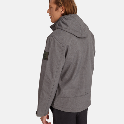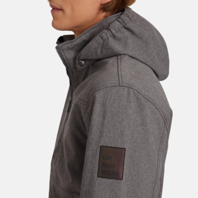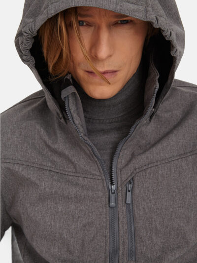 Men’s windproof Softshell jacket. Brushed soft on the inside. Integrated elastic band around the hood. Removable snap-on hood. Adjustable sleeve ends. Integrated zippered pockets. Adjustable drawstring tunnel at bottom. Reflective elements.