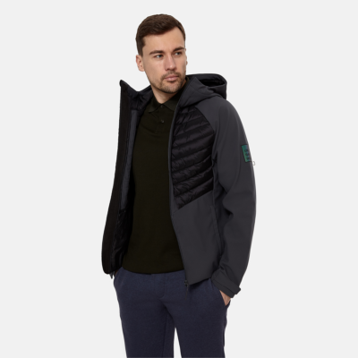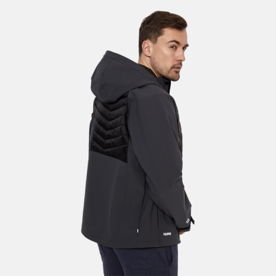 Men’s waterproof and windproof hybrid jacket. Hood, sleeves and bottom part are made from soft Softshell fabric. The quilted slightly glossy top part is filled with innovative recycled material imitating the properties of feather fill. The material is warm, dries quickly and does not clump after washing. Brushed soft on the inside. Adjustable sleeve ends. Zipper fastening. Integrated zipper pockets at front. Reflective elements.