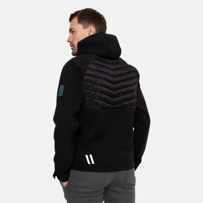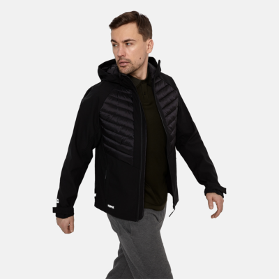 Men’s waterproof and windproof hybrid jacket. Hood, sleeves and bottom part are made from soft Softshell fabric. The quilted slightly glossy top part is filled with innovative recycled material imitating the properties of feather fill. The material is warm, dries quickly and does not clump after washing. Brushed soft on the inside. Adjustable sleeve ends. Zipper fastening. Integrated zipper pockets at front. Reflective elements.