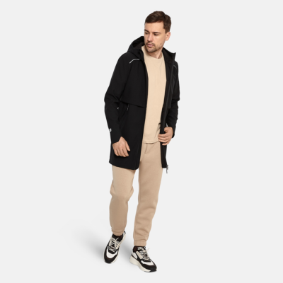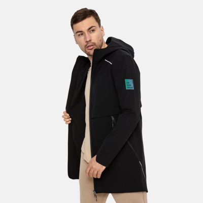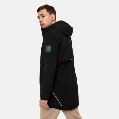 Men´s windproof Softshell parka. The inner lining of the parka is made of a soft brushed material. It has an adjustable waist and hood with stoppers and is decorated with reflective details.