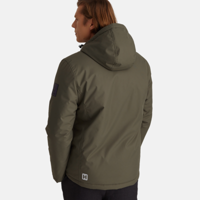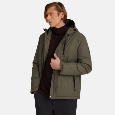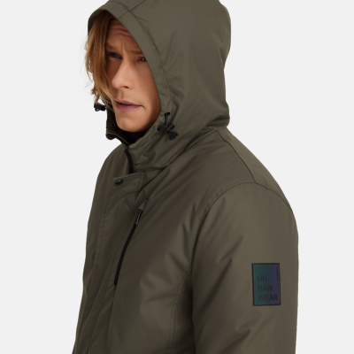Water- and windproof semi-season jacket for men. Breathable outer fabric. The inside of the jacket is made of soft lining fabric. The removable hood attaches to the collar with press studs. Rubber band incorporated in the sleeve ends and the edge of the hood. Zipper fastener. Pockets with integrated zipper in the front piece. Rubber band tunnel with stoppers incorporated at the bottom. Reflective details on the outer fabric.