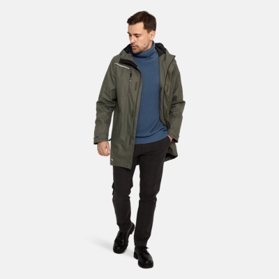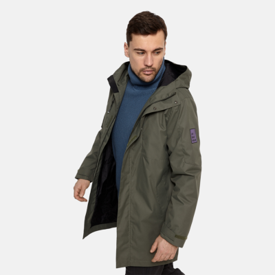 Insulated (40 g) water- and windproof parka for men, suitable for spring and autumn. The top layer of the parka is made of a breathable material. It has soft lining, adjustable hood and sleeve ends. It has ribbed sleeve cuffs. The parka has waterproof, taped seams and is decorated with reflective details.
