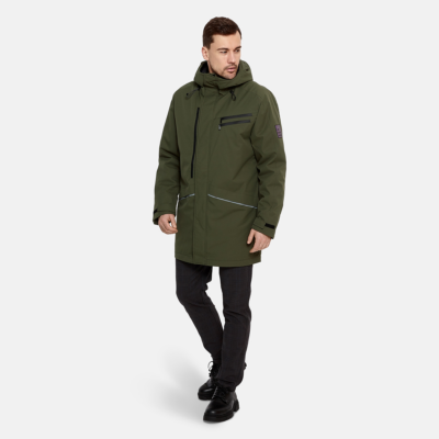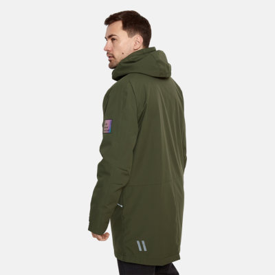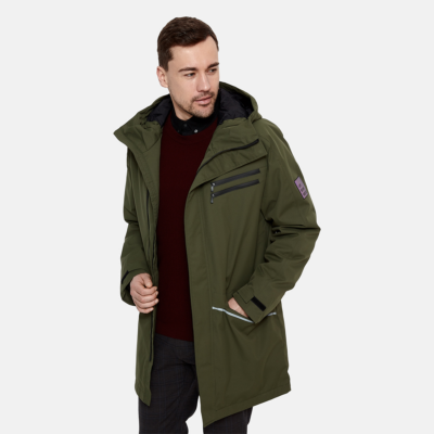 Men’s waterproof and windproof spring and autumn parka Breathable fabric Soft lining on the inside Adjustable hood and sleeve ends Ribbed cuffs at sleeve ends Integrated breast pockets with waterproof zippers Waterproof taped seams Reflective elements on fabric