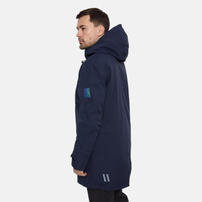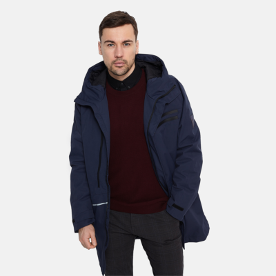 Men’s waterproof and windproof spring and autumn parka Breathable fabric Soft lining on the inside Adjustable hood and sleeve ends Ribbed cuffs at sleeve ends Integrated breast pockets with waterproof zippers Waterproof taped seams Reflective elements on fabric