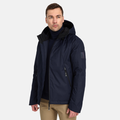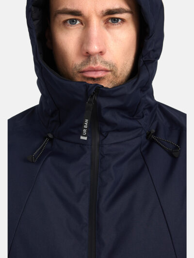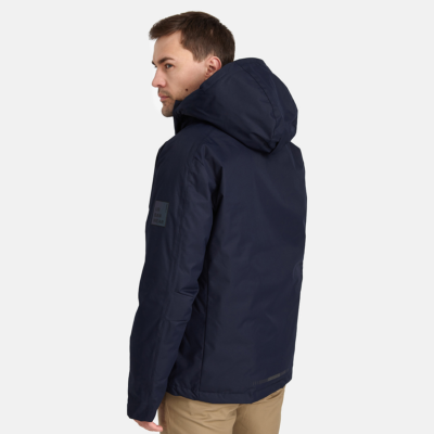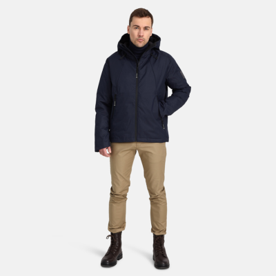 Men’s waterproof and windproof winter jacket. Breathable fabric. Soft lining on the inside. Adjustable hood. Ribbed cuffs at sleeve ends. Waterproof zipper at front, zippered pockets. Integrated drawstring tunnel with stoppers at bottom. The jacket is filled with innovative recycled material imitating the properties of feather fill. The material is warm, dries quickly and does not clump after washing. A great alternative to natural feather fill. Reflective elements on fabric.