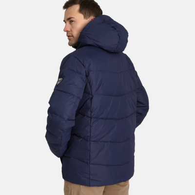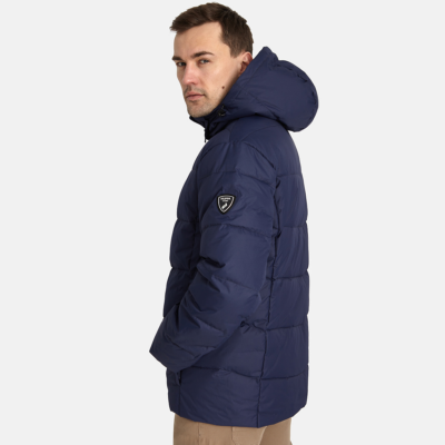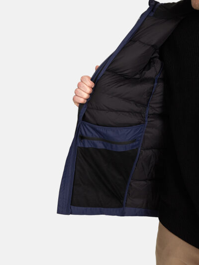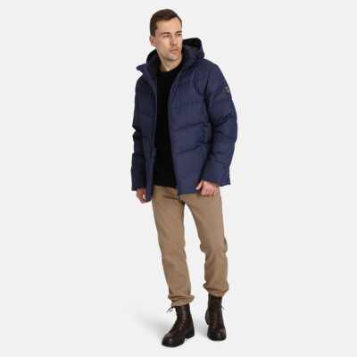 Men’s waterproof and windproof down jacket. Breathable fabric. Soft mesh lining on the inside. Down feathers and feathers for filling. Removable adjustable snap-on hood. Ribbed cuffs at sleeve ends. Zipper fastening. Integrated zipper pockets at front. Reflective elements on fabric.