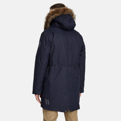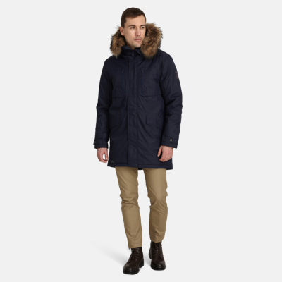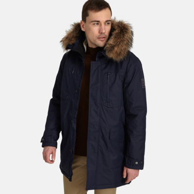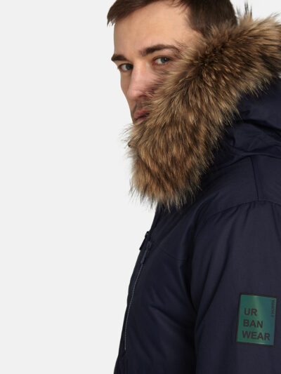 Men’s waterproof and windproof winter parka. Breathable fabric. Soft fabric on the inside. Faux sheepskin lining at the top of the back and inside the hood. Adjustable hood. Ribbed cuffs at sleeve ends. Adjustable sleeve ends. Two-way zipper covered with stud-press flap at front. Drawstring tunnel with stoppers on waist. Waterproof taped seams. Removable natural fur trim on hood. Reflective elements on fabric.