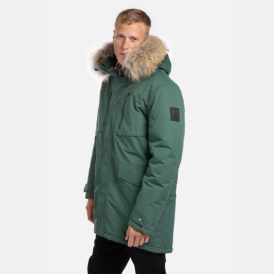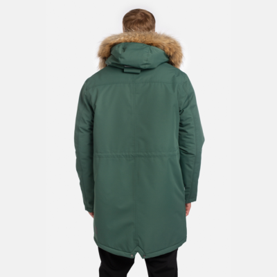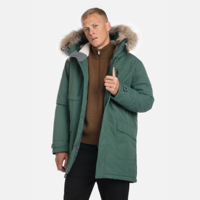 Men’s waterproof and windproof winter parka. Breathable fabric. Soft fabric on the inside. Faux sheepskin lining at the top of the back and inside the hood. Adjustable hood. Ribbed cuffs at sleeve ends. Adjustable sleeve ends. Two-way zipper covered with stud-press flap at front. Drawstring tunnel with stoppers on waist. Waterproof taped seams. Removable natural fur trim on hood. Reflective elements on fabric.