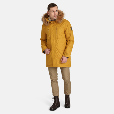 Men’s waterproof and windproof winter parka. Breathable fabric. Soft fabric on the inside. Faux sheepskin lining at the top of the back and inside the hood. Adjustable hood. Ribbed cuffs at sleeve ends. Adjustable sleeve ends. Two-way zipper covered with stud-press flap at front. Drawstring tunnel with stoppers on waist. Waterproof taped seams. Removable natural fur trim on hood. Reflective elements on fabric.