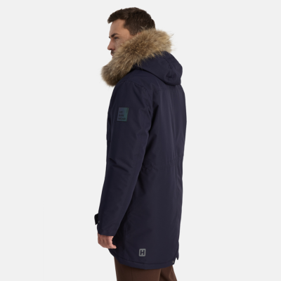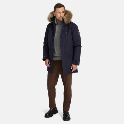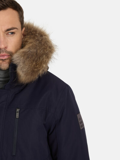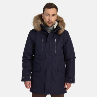 Men’s waterproof and windproof winter parka. Breathable fabric. Soft fabric on the inside. Faux sheepskin lining at the top of the back and inside the hood. Adjustable hood. Ribbed cuffs at sleeve ends. Adjustable sleeve ends. Two-way zipper covered with stud-press flap at front. Drawstring tunnel with stoppers on waist. Waterproof taped seams. Removable natural fur trim on hood. Reflective elements on fabric.