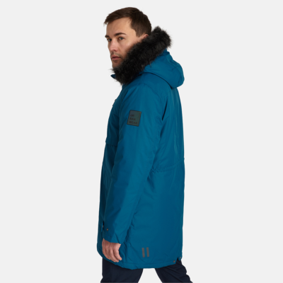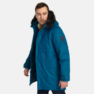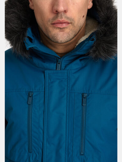 Men’s waterproof and windproof winter parka. Breathable fabric. Soft fabric on the inside. Faux sheepskin lining at the top of the back and inside the hood. Adjustable hood. Ribbed cuffs at sleeve ends. Adjustable sleeve ends. Two-way zipper covered with press button flap at front. Drawstring tunnel with stoppers on waist. Waterproof taped seams. Removable faux fur trim on hood. Reflective elements on fabric.