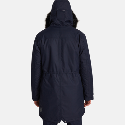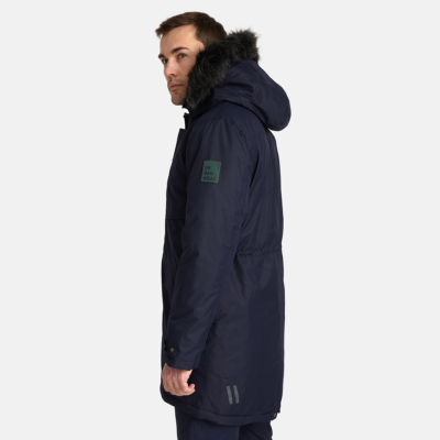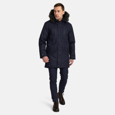 Men’s waterproof and windproof winter parka. Breathable fabric. Soft fabric on the inside. Faux sheepskin lining at the top of the back and inside the hood. Adjustable hood. Ribbed cuffs at sleeve ends. Adjustable sleeve ends. Two-way zipper covered with press button flap at front. Drawstring tunnel with stoppers on waist. Waterproof taped seams. Removable faux fur trim on hood. Reflective elements on fabric.