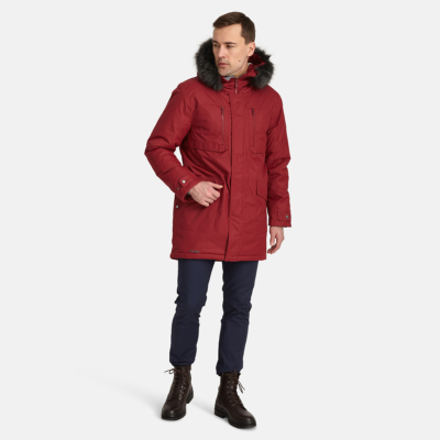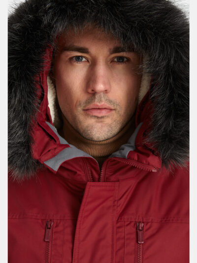 Men’s waterproof and windproof winter parka. Breathable fabric. Soft fabric on the inside. Faux sheepskin lining at the top of the back and inside the hood. Adjustable hood. Ribbed cuffs at sleeve ends. Adjustable sleeve ends. Two-way zipper covered with press button flap at front. Drawstring tunnel with stoppers on waist. Waterproof taped seams. Removable faux fur trim on hood. Reflective elements on fabric.
