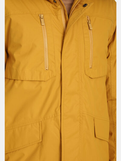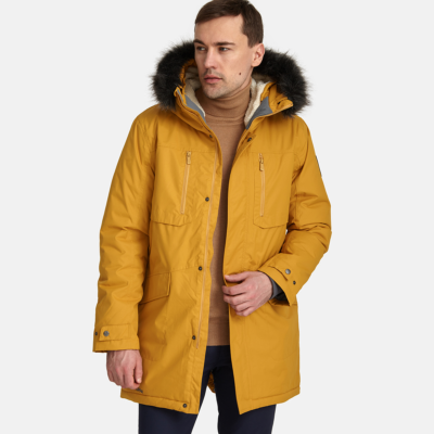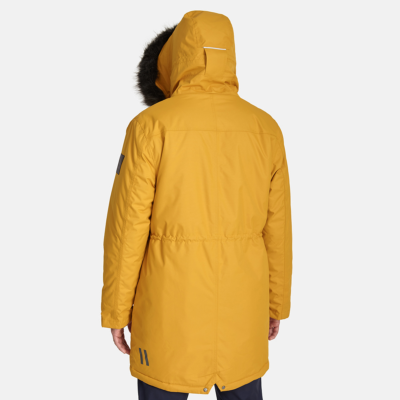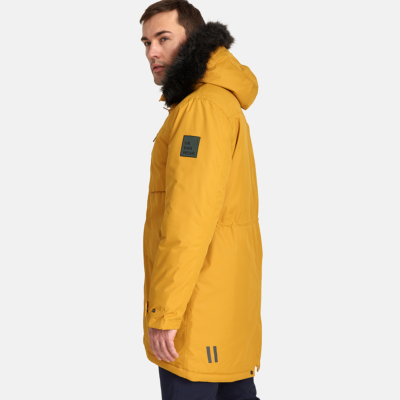 Men’s waterproof and windproof winter parka. Breathable fabric. Soft fabric on the inside. Faux sheepskin lining at the top of the back and inside the hood. Adjustable hood. Ribbed cuffs at sleeve ends. Adjustable sleeve ends. Two-way zipper covered with press button flap at front. Drawstring tunnel with stoppers on waist. Waterproof taped seams. Removable faux fur trim on hood. Reflective elements on fabric.