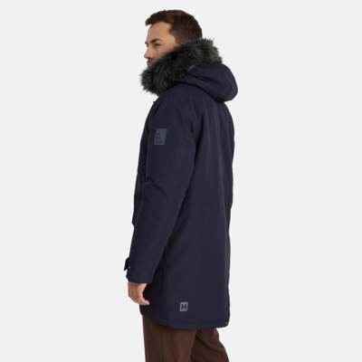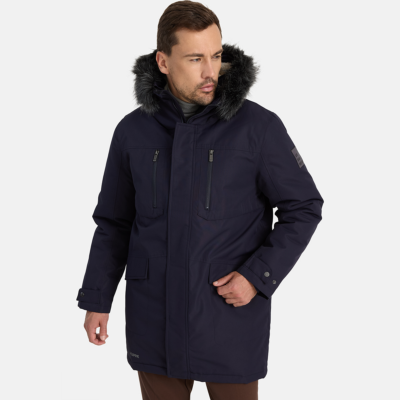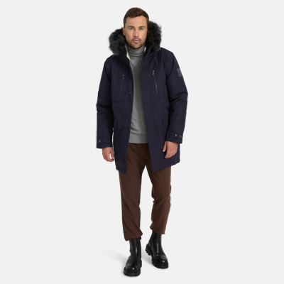 Men’s waterproof and windproof winter parka. Breathable fabric. Soft fabric on the inside. Faux sheepskin lining at the top of the back and inside the hood. Adjustable hood. Ribbed cuffs at sleeve ends. Adjustable sleeve ends. Two-way zipper covered with press button flap at front. Drawstring tunnel with stoppers on waist. Waterproof taped seams. Removable faux fur trim on hood. Reflective elements on fabric.