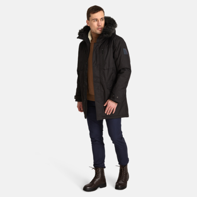 Men’s waterproof and windproof winter parka. Breathable fabric. Soft fabric on the inside. Faux sheepskin lining at the top of the back and inside the hood. Adjustable hood. Ribbed cuffs at sleeve ends. Adjustable sleeve ends. Two-way zipper covered with press button flap at front. Drawstring tunnel with stoppers on waist. Waterproof taped seams. Removable faux fur trim on hood. Reflective elements on fabric.
