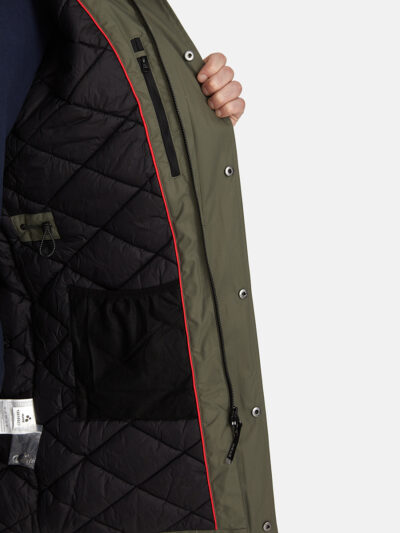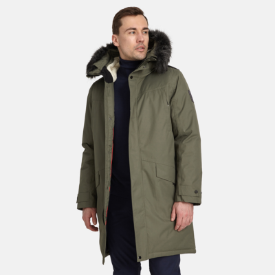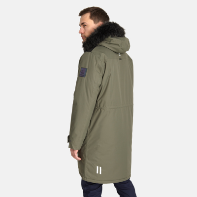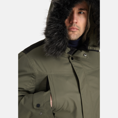Men´s waterproof and windproof winter coat. Breathable outer fabric. Soft inner fabric. Faux sheepskin lining on the upper back and inside the hood. Adjustable hood. Ribbed cuffs at the sleeve ends. Adjustable sleeve ends. Two-way zipper covered with a press stud at the front. Front pockets with zippers covered by a flap with a magnetic closure. Elastic cord tunnel with stoppers at the waist. Waterproof taped seams. Removable faux fur trim on the hood. Reflective details on the outer fabric.