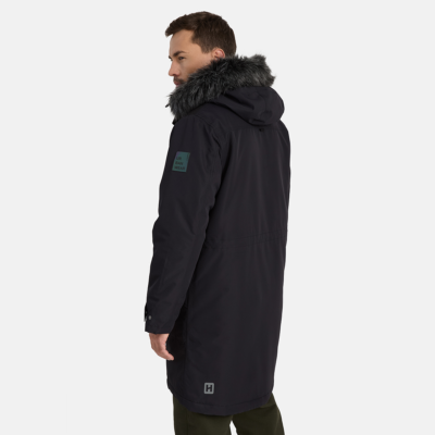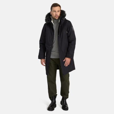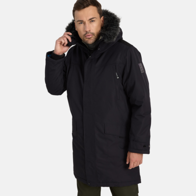 Men´s waterproof and windproof winter coat. Breathable outer fabric. Soft inner fabric. Faux sheepskin lining on the upper back and inside the hood. Adjustable hood. Ribbed cuffs at the sleeve ends. Adjustable sleeve ends. Two-way zipper covered with a press stud at the front. Front pockets with zippers covered by a flap with a magnetic closure. Elastic cord tunnel with stoppers at the waist. Waterproof taped seams. Removable faux fur trim on the hood. Reflective details on the outer fabric.