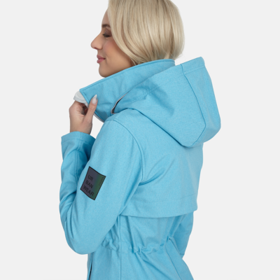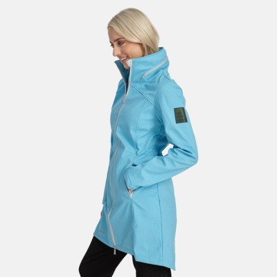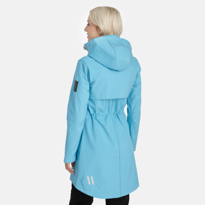 Women’s windproof Softshell coat Dotted reflective print all over Brushed soft on the inside Hood can be stowed away inside stand-up collar Integrated zippered pockets Drawstring tunnel with stoppers on waist