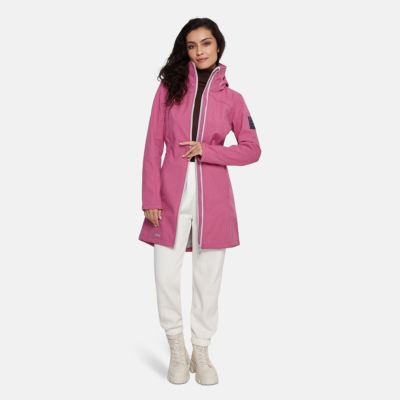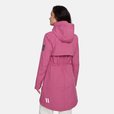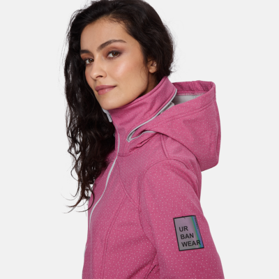 Women’s windproof Softshell coat Dotted reflective print all over Brushed soft on the inside Hood can be stowed away inside stand-up collar Integrated zippered pockets Drawstring tunnel with stoppers on waist