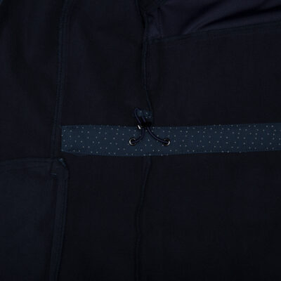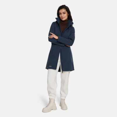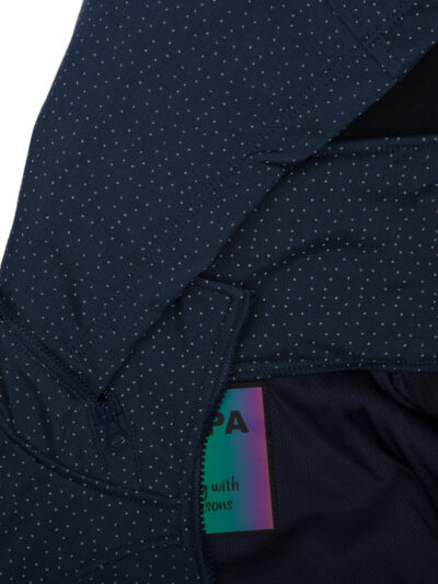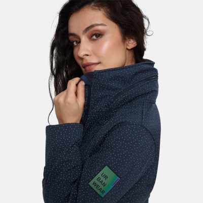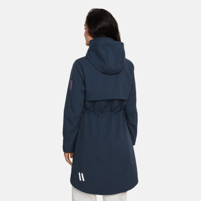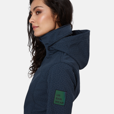 Women’s windproof Softshell coat Dotted reflective print all over Brushed soft on the inside Hood can be stowed away inside stand-up collar Integrated zippered pockets Drawstring tunnel with stoppers on waist
