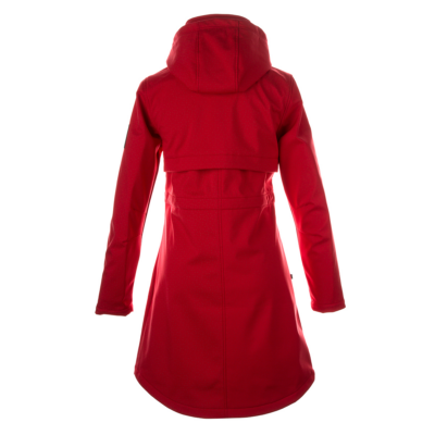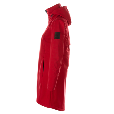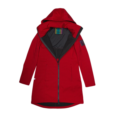Women’s windproof Softshell coat. Dotted reflective print all over. Brushed soft on the inside. Hood can be stowed away inside stand-up collar. Integrated zippered pockets. Drawstring tunnel with stoppers on waist.