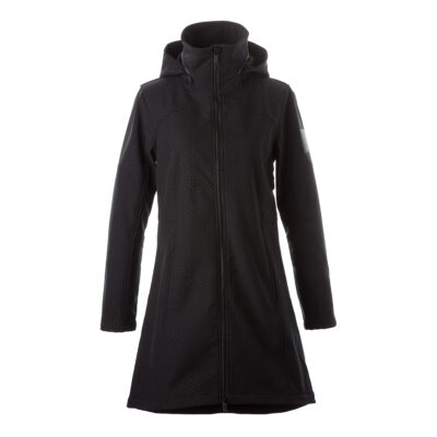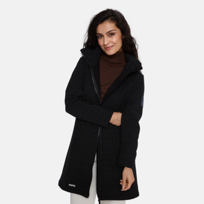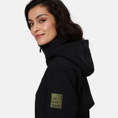 Women’s windproof Softshell coat. Dotted reflective print all over. Brushed soft on the inside. Hood can be stowed away inside stand-up collar. Integrated zippered pockets. Drawstring tunnel with stoppers on waist.