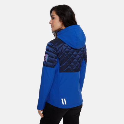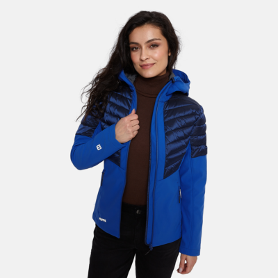 Women’s waterproof and windproof hybrid jacket. Hood, sleeves and bottom part are made from soft Softshell fabric. The quilted slightly glossy top part is filled with innovative recycled material imitating the properties of feather fill. The material is warm, dries quickly and does not clump after washing. Brushed soft on the inside. Zipper fastening. Integrated zipper pockets at front. Reflective elements.