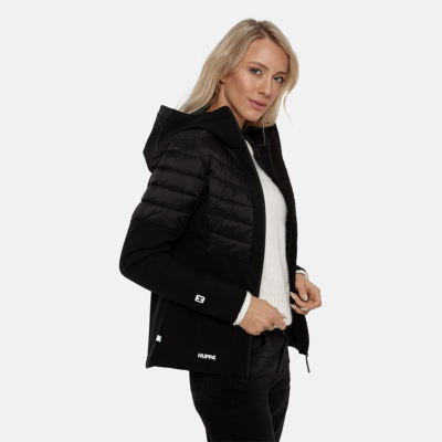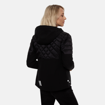 Women’s waterproof and windproof hybrid jacket. Hood, sleeves and bottom part are made from soft Softshell fabric. The quilted slightly glossy top part is filled with innovative recycled material imitating the properties of feather fill. The material is warm, dries quickly and does not clump after washing. Brushed soft on the inside. Zipper fastening. Integrated zipper pockets at front. Reflective elements.