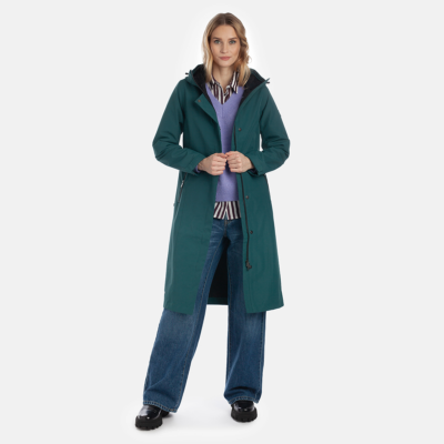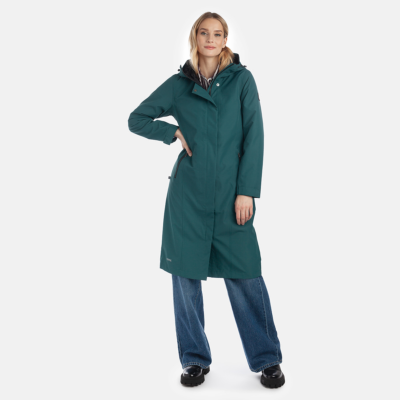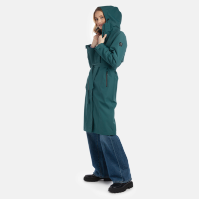 Water- and windproof ShellProtect coat for women. ShellProtect fabric is an innovative, three-layer material, therefore the product does not have a lining. Adjustable hood and sleeve cuffs. Waterproof taped seams. The coat features an adjustable waist belt for a customizable fit. Front two-way zipper with a snap button placket. Reflective elements on fabric.
