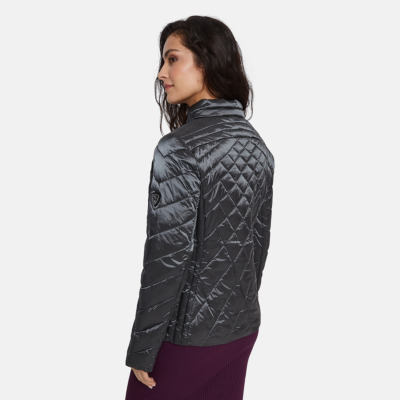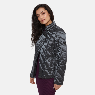 Quilted women’s jacket. Windproof slightly glossy top fabric. The jacket is filled with innovative recycled material imitating the properties of feather fill. The material is warm, dries quickly and does not clump after washing. A great alternative to natural feather fill.