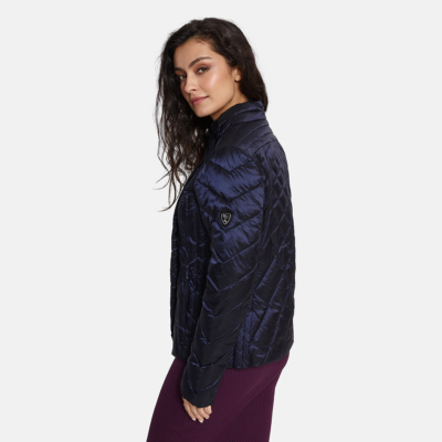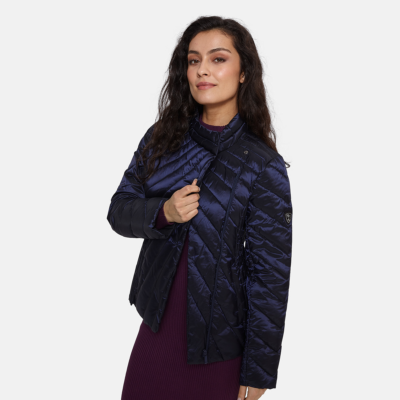 Quilted women’s jacket. Windproof slightly glossy top fabric. The jacket is filled with innovative recycled material imitating the properties of feather fill. The material is warm, dries quickly and does not clump after washing. A great alternative to natural feather fill.
