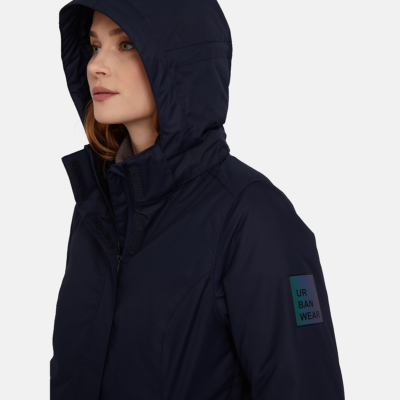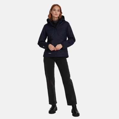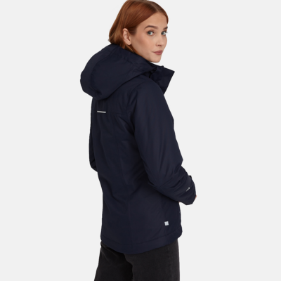 Water- and windproof spring-autumn jacket with 40g insulation for women. Detachable adjustable hood fastens to the collar with a zip. Rubber cord tunnel with stoppers at the bottom. Adjustable hood and sleeve cuffs. Pocket under the front fastening. Reflective elements on fabric.