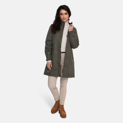 Women’s waterproof and windproof spring and autumn parka. Breathable fabric. Soft lining on the inside. Adjustable hood and sleeve ends. Drawstring tunnel with stoppers on waist. Waterproof taped seams. Reflective elements on fabric.