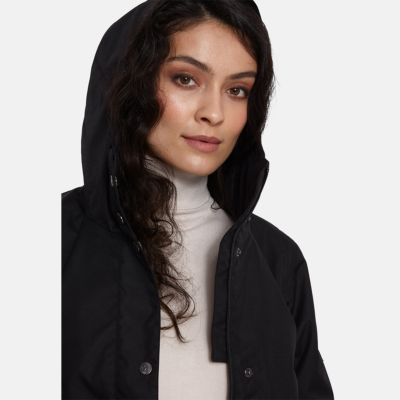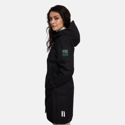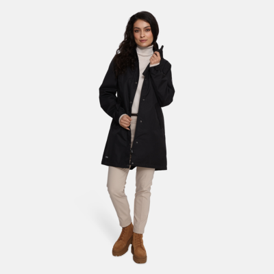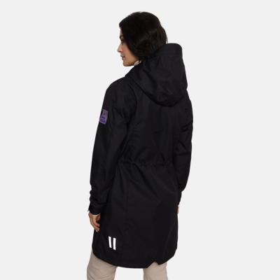Women’s waterproof and windproof spring and autumn parka. Breathable fabric. Soft lining on the inside. Adjustable hood and sleeve ends. Drawstring tunnel with stoppers on waist. Waterproof taped seams. Reflective elements on fabric.