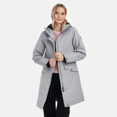 Insulated (40 g) water- and windproof parka for women, suitable for spring and autumn. The outer fabric is breathable. The lining of the parka is soft. Adjustable hood and sleeve cuffs. Adjustable waist with stoppers. Waterproof taped seams. The outer fabric is decorated with reflective details.