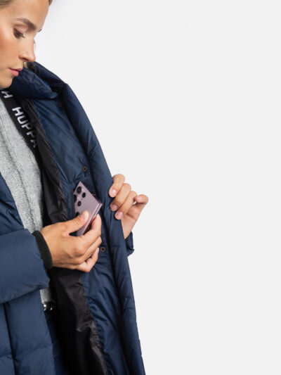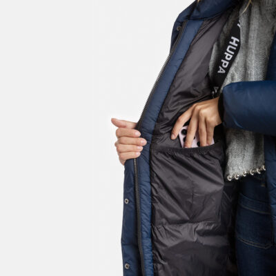 A women’s down coat that is water-repellent, windproof, and built for warmth, comfort, and protection. The breathable outer fabric is made from recycled fibres. Soft lining fabric inside the coat. Filled with feathers and down feathers. Ribbed cuffs on sleeves. Front two-way zipper with a snap button placket. The coat has removable elastic suspenders. Reflective detailing on outer fabric.